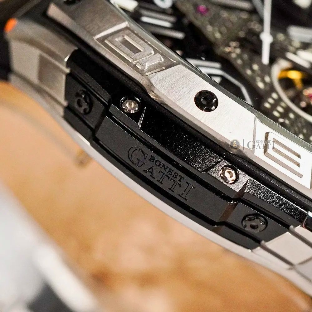 Không chỉ gây ấn tượng ở mặt trước và mặt sau, Bonest Gatti BG9970 còn chú trọng đến từng chi tiết nhỏ như mặt bên đồng hồ – nơi logo thương hiệu được khắc sắc nét, thể hiện tinh thần thể thao cao cấp